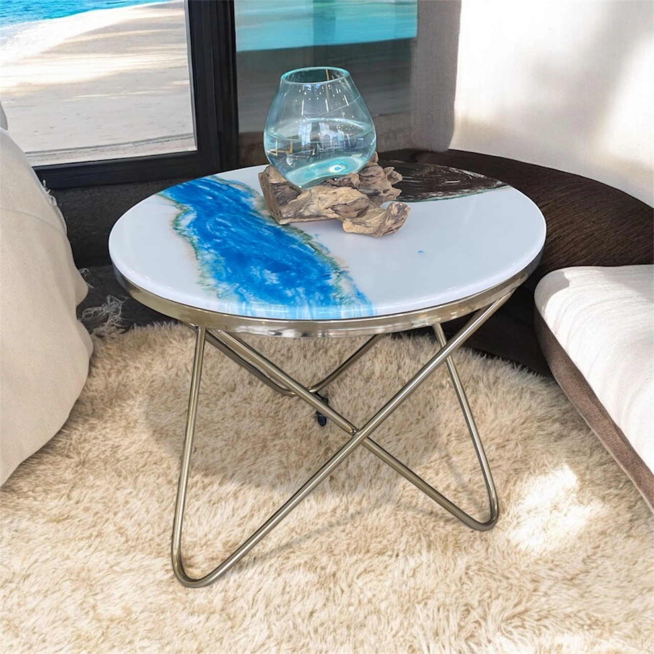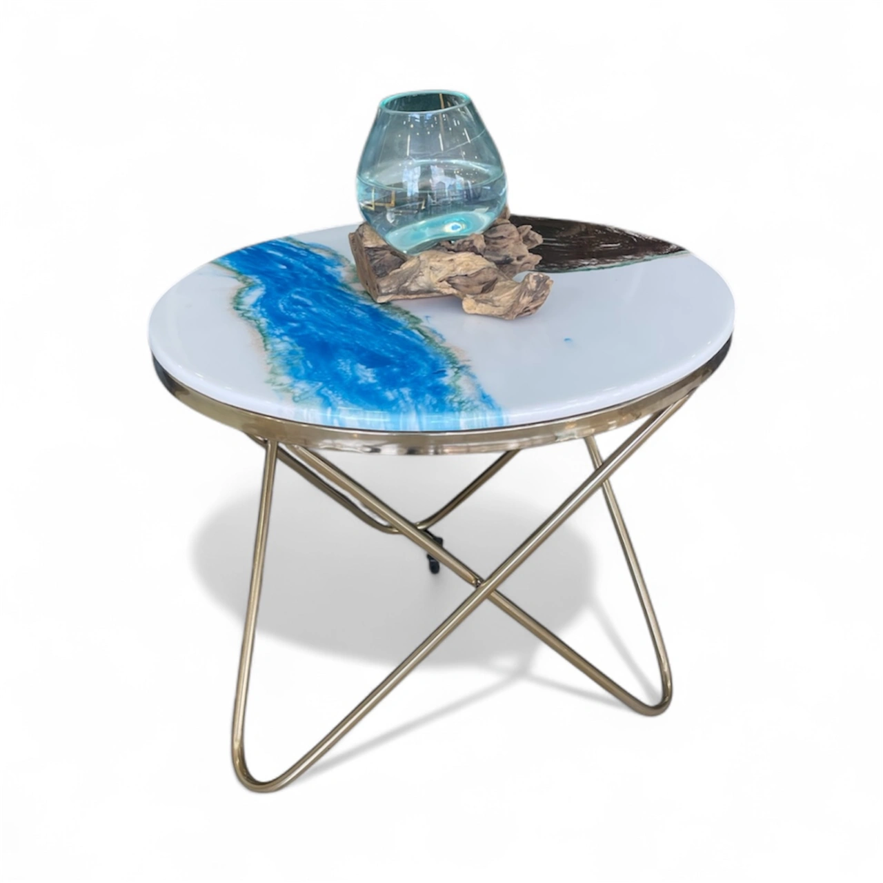 Add a touch of modern luxury to your space with our Epoxy Top Console Table, designed to blend art and functionality. The stunning epoxy resin top showcases a unique glossy finish and handcrafted patterns that make every piece one of a kind. Its chrome golden stainless steel base adds a sleek, elegant look with strong support and long-lasting durability.