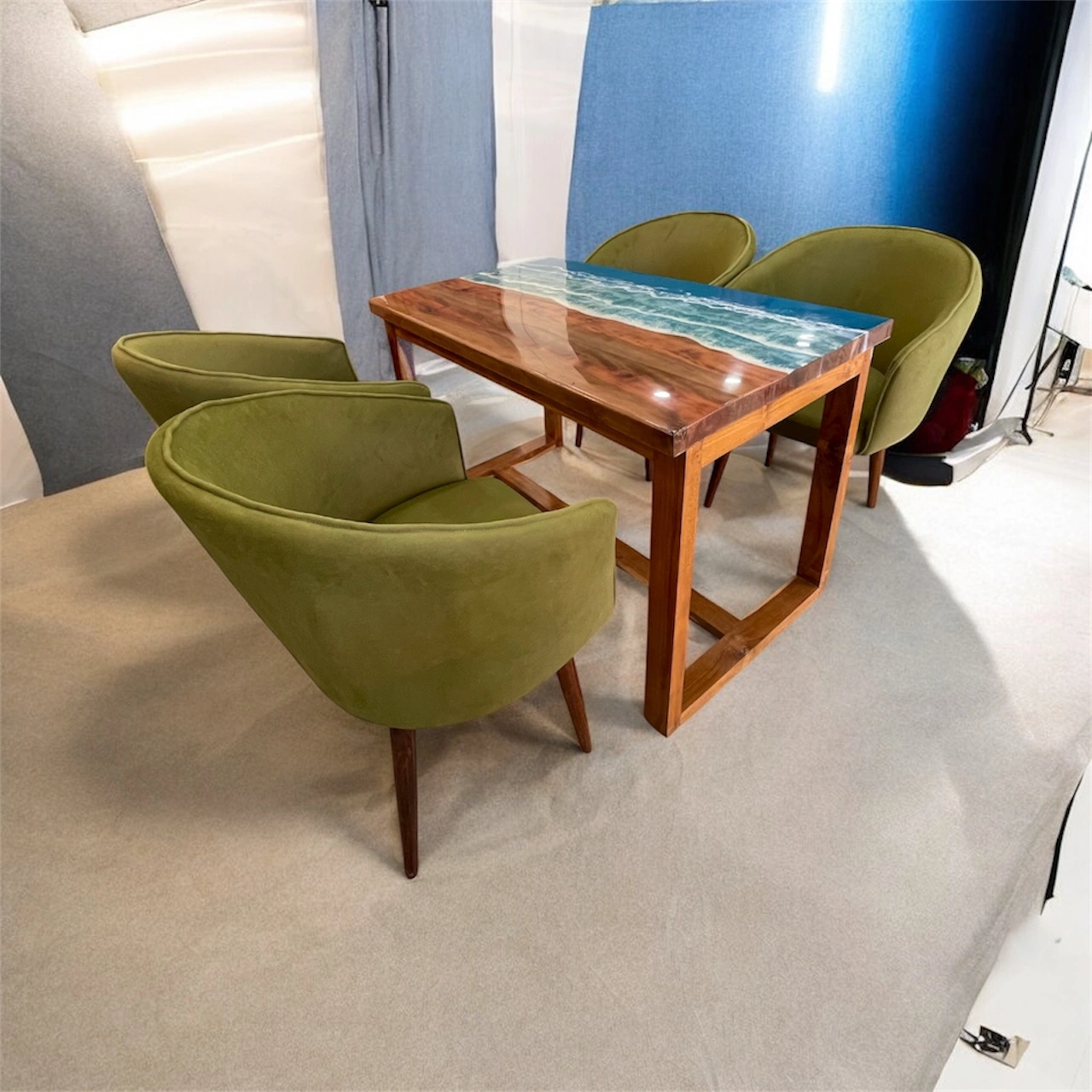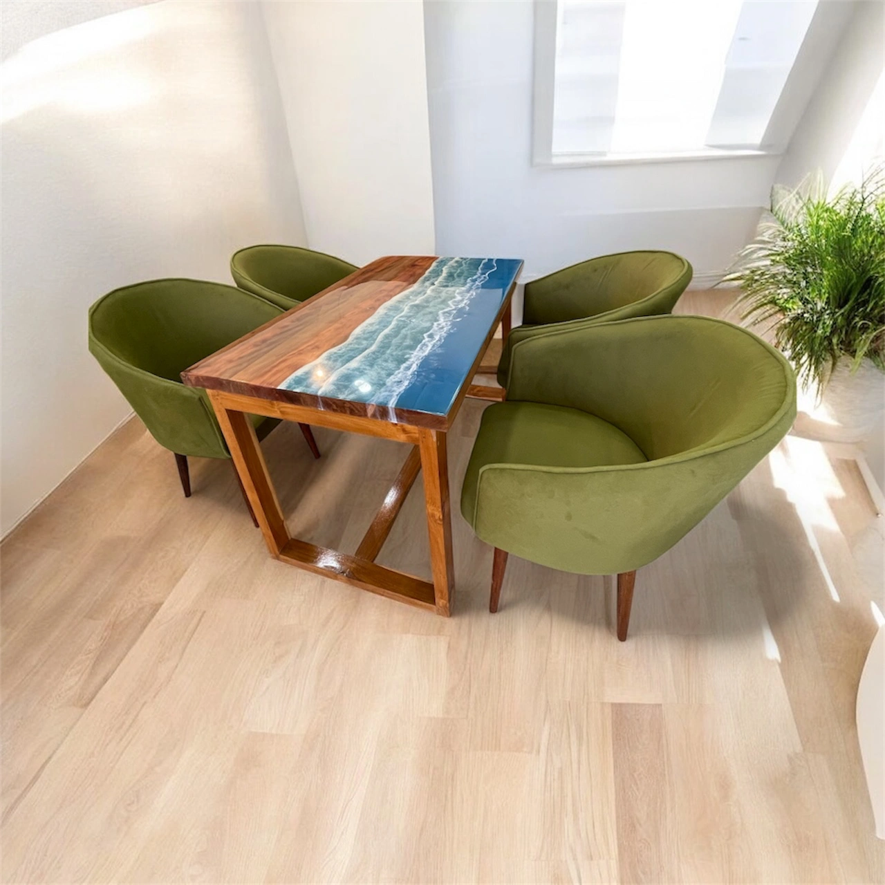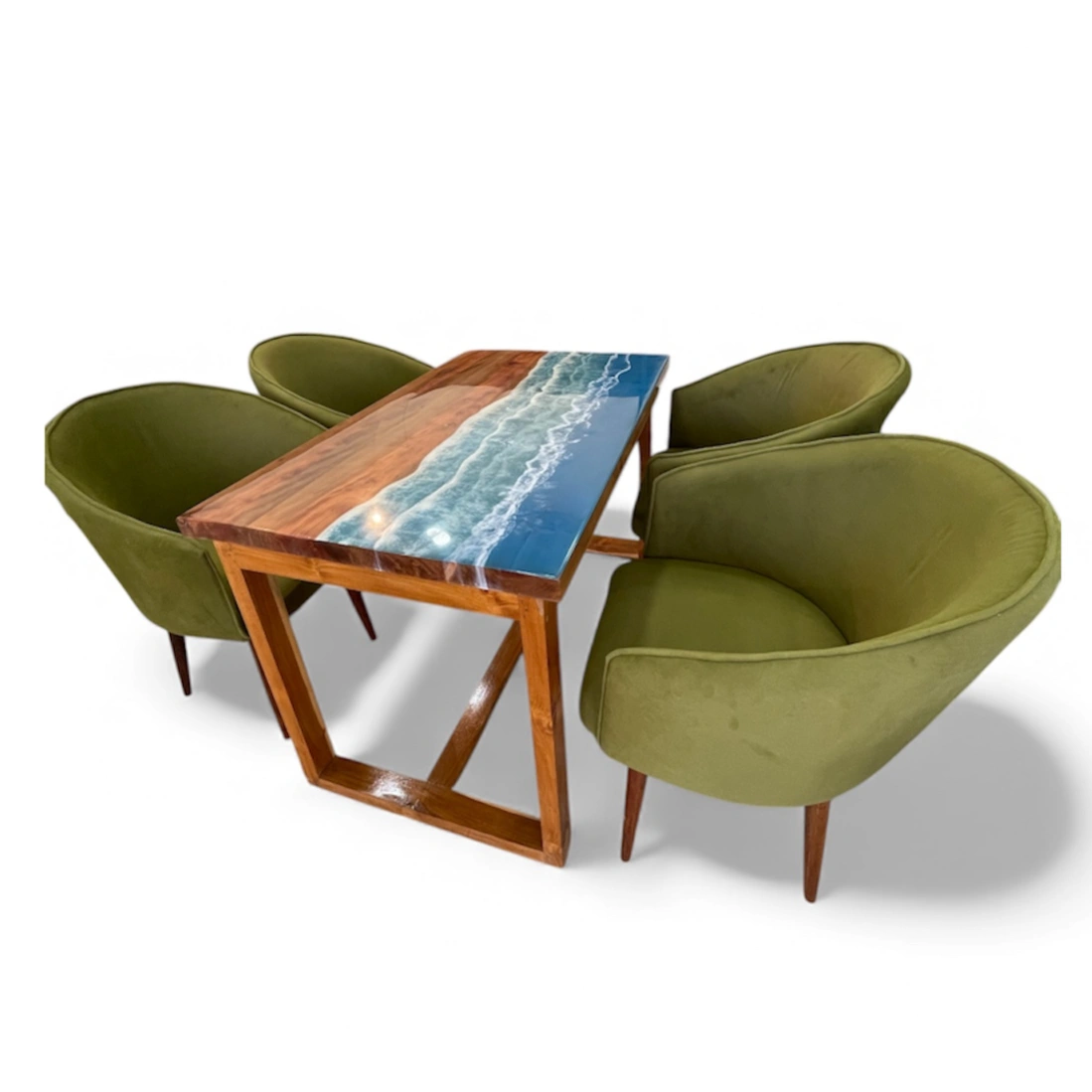 Experience the perfect blend of art, comfort, and durability with our Wooden Epoxy Dining Set, crafted from premium Sisham wood and paired with luxurious velvet fabric chairs. The dining table features a handcrafted epoxy resin top that beautifully highlights the natural grains of solid Sisham wood, creating a striking and timeless centerpiece.